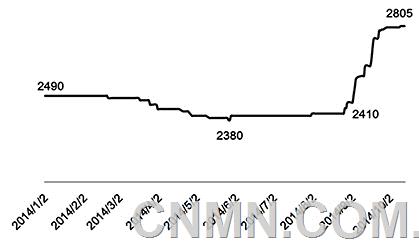 2014年三季度,国产氧化铝现货平均价格从7月初的2400元/吨涨至9月底的2800元/吨,特别是在9月份,国产氧化铝价格快速上涨,环比上涨了近400元/吨。三季度,煤炭价格有所下降,一定程度缓解了电解铝企业因氧化铝价格上涨造成的成本压力。2014年以来国产氧化铝现货平均价格见图5。