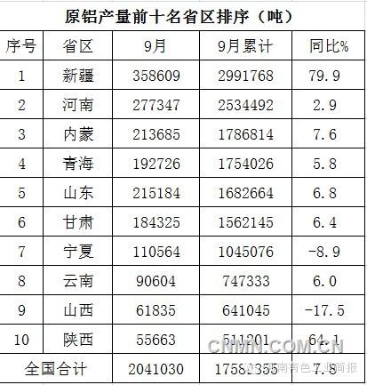 铝前十名省区总量1526万吨,占全国总量的86.7%。