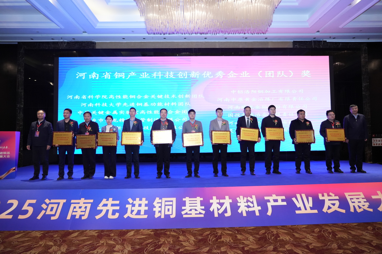 中铝洛阳铜加工有限公司董事长曹旗文,河南中原黄金冶炼厂有限责任公司总经理廖忠义,河南新昌铜业集团有限公司董事长柴兴臣3人被授予“河南省铜产业创新发展特殊贡献奖”;河南省科学院高性能铜合金关键技术创新团队、河南科技大学先进铜基功能材料团队、中原关键金属实验室高性能铜合金团队、新乡市金龙精密铜管制造公司、河南凯美龙新材料、中铝洛阳铜加工、中原黄金冶炼厂、豫光金铅、国投金城、新昌电工、朝辉铜业等11家单位被授予“河南省铜产业科技创新优秀企业(团队)”荣誉称号。
